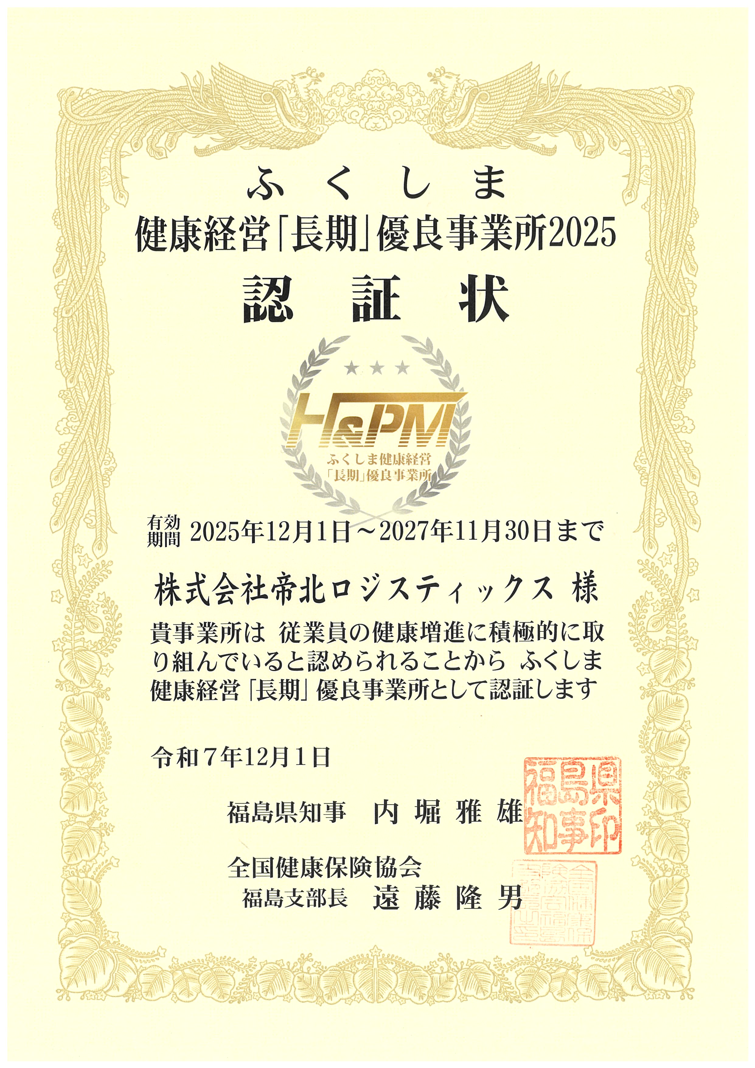 - 運送事業部が「運転者職場環境良好度認証(働きやすい職場認証)」に認証